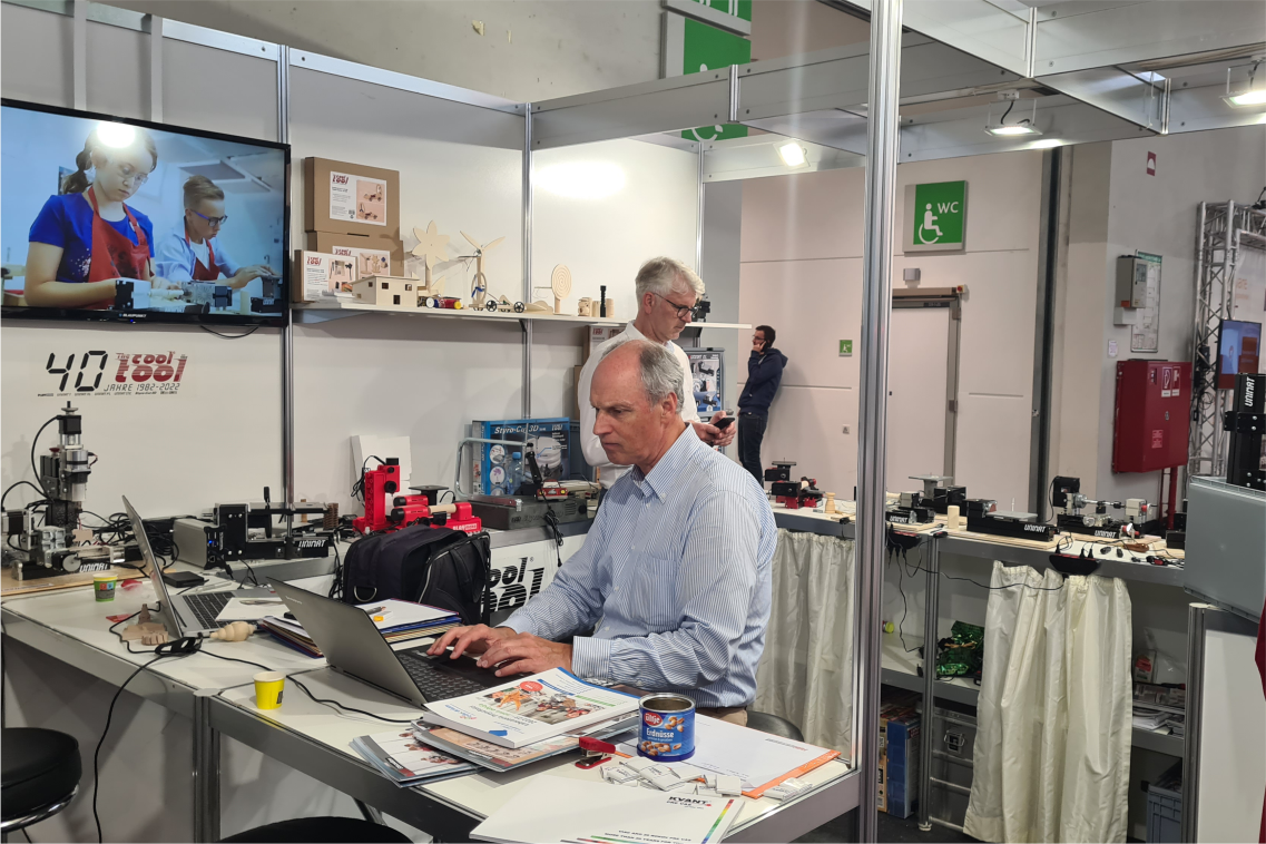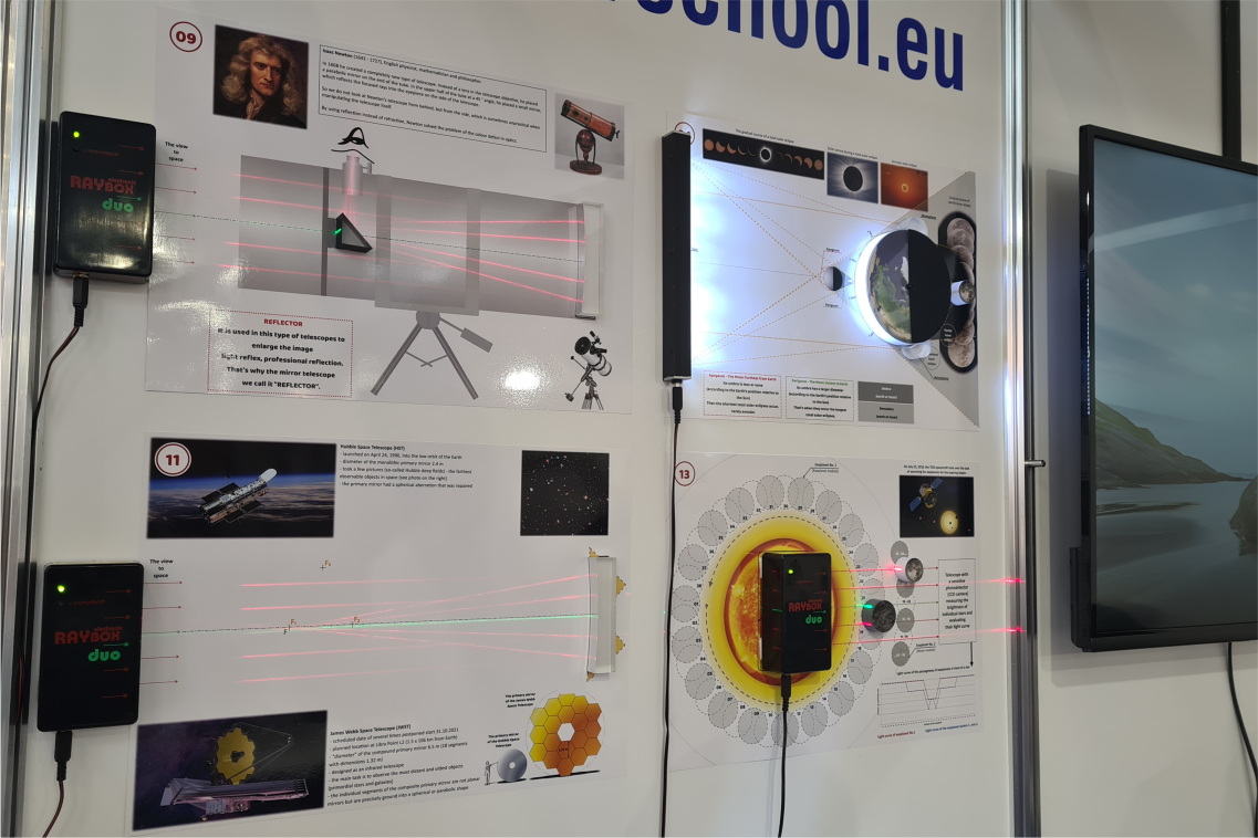 Napriek tomu, že sme oficiálne neboli registrovaní ako vystavovatelia, dobré vzťahy s rakúskou firmou The CoolTool nám umožnili využívať časť priestorov ich stánku, a tak sa prezentovať aj našimi produktmi z portfólia KVANT forschool. Na našej časti steny nechýbala veleznáma GONka či nové verzie spektrometrov Spectra so Spectralom PLUS. Oči návštevníkov pútala taktiež naša stále horúca astronovinka – Astro Laser Set, ktorá vzbudzovala azda najväčší záujem.